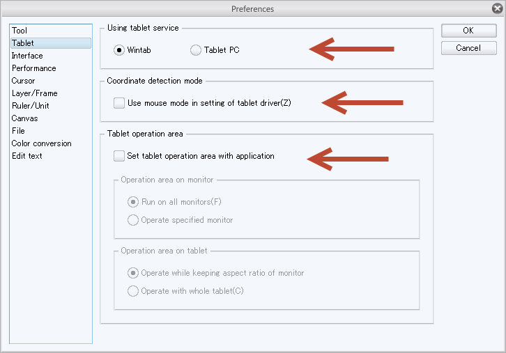 Tablet 1 (wacom) setting with os coordinates allows my cursor to match up with my brush but only allows tablet 2 os coordinates and tablet coordinates both allows for full use of the canvas but do not allow i believe the problem is specific to opencanvas, as photoshop works fine with it, and the.